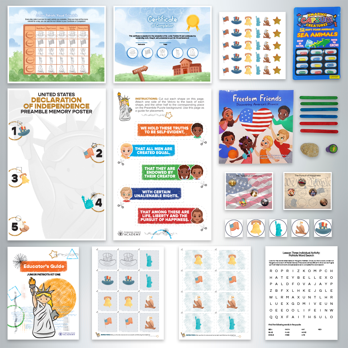 The Junior Patriots Kit is a five-lesson unit study designed for kindergarten through second-grade students, available for either five students (Homeschool Edition) or 30 students (Classroom Edition). Focused on the Declaration of Independence, this kit helps young learners understand the founding principles of the United States, including the values of Life, Liberty, and the pursuit of Happiness. Through engaging games, activities, and object lessons, students will explore the importance of these ideals and the historical figures who helped shape the nation’s independence.